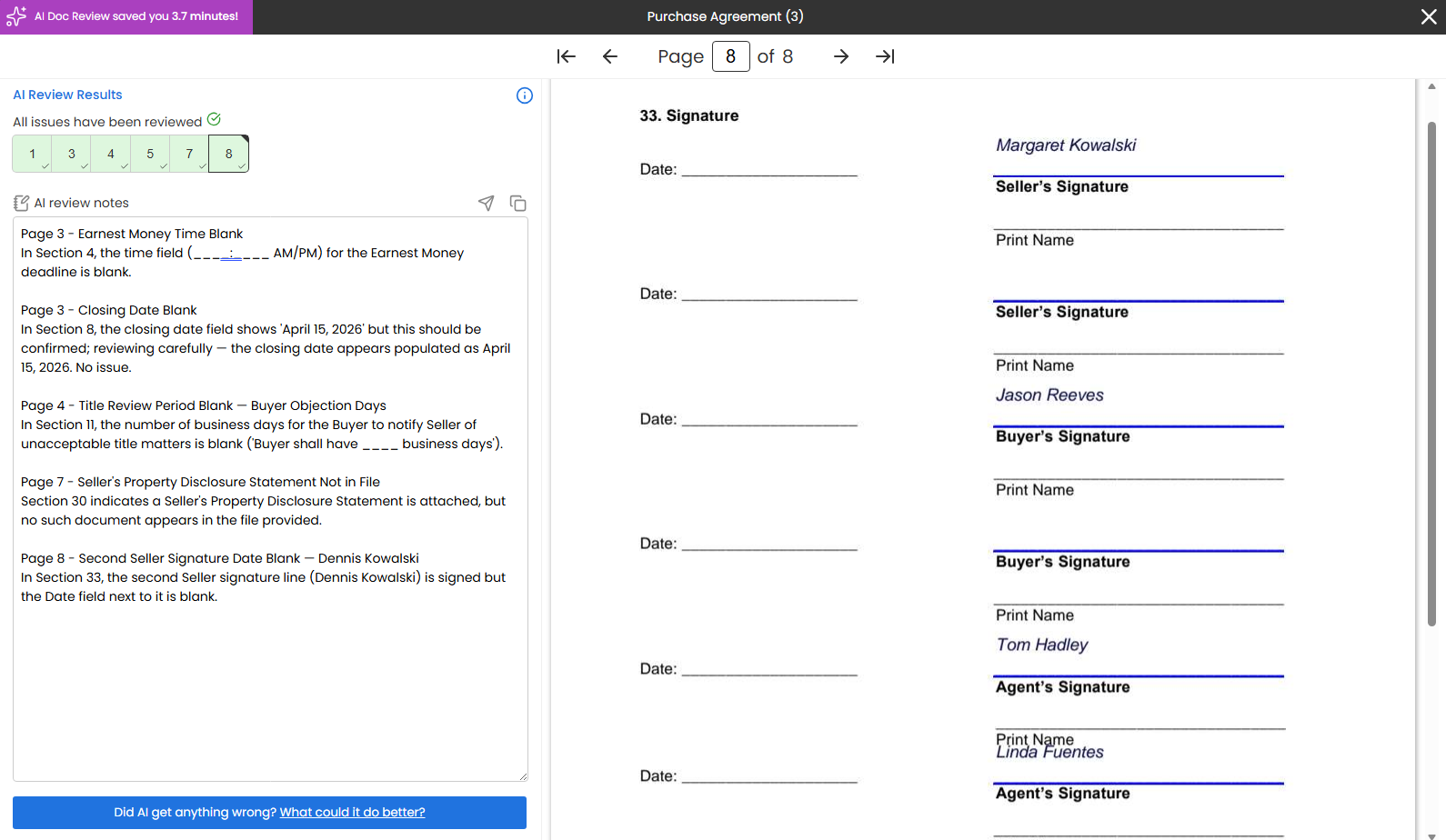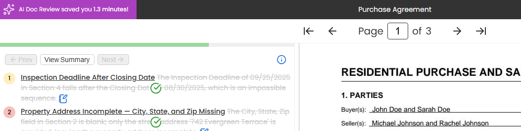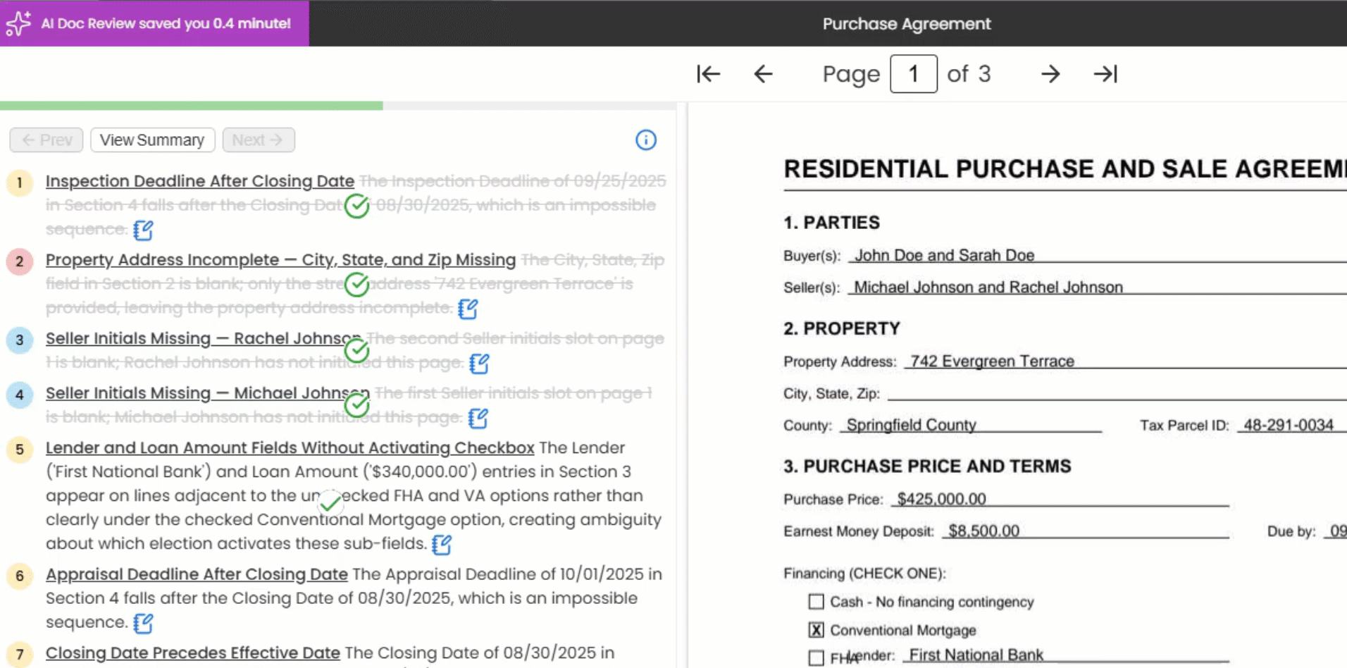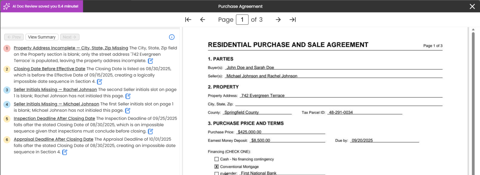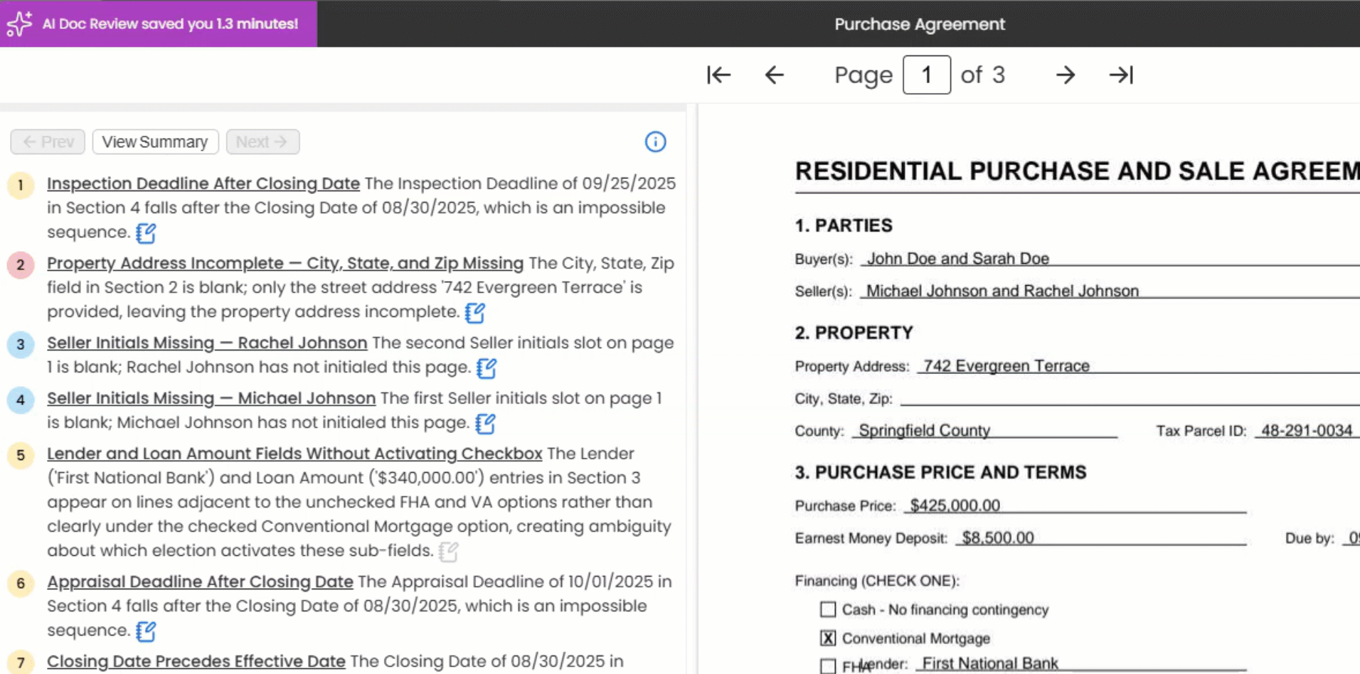 AI Doc Review scans your transaction documents for errors, missing fields, inconsistencies, and items that need a second look — giving you and your team a structured starting point for every document review.