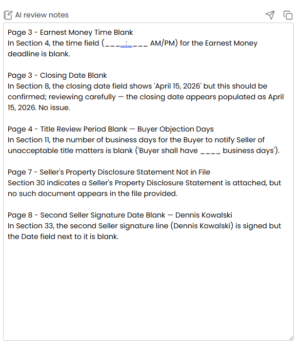 Items worth a second look. Checks flag items like missing initials, an empty broker or agent block, a default election taking effect because no box was checked, or an entry that may be illegible. Lower priority, but worth confirming before the document moves forward.